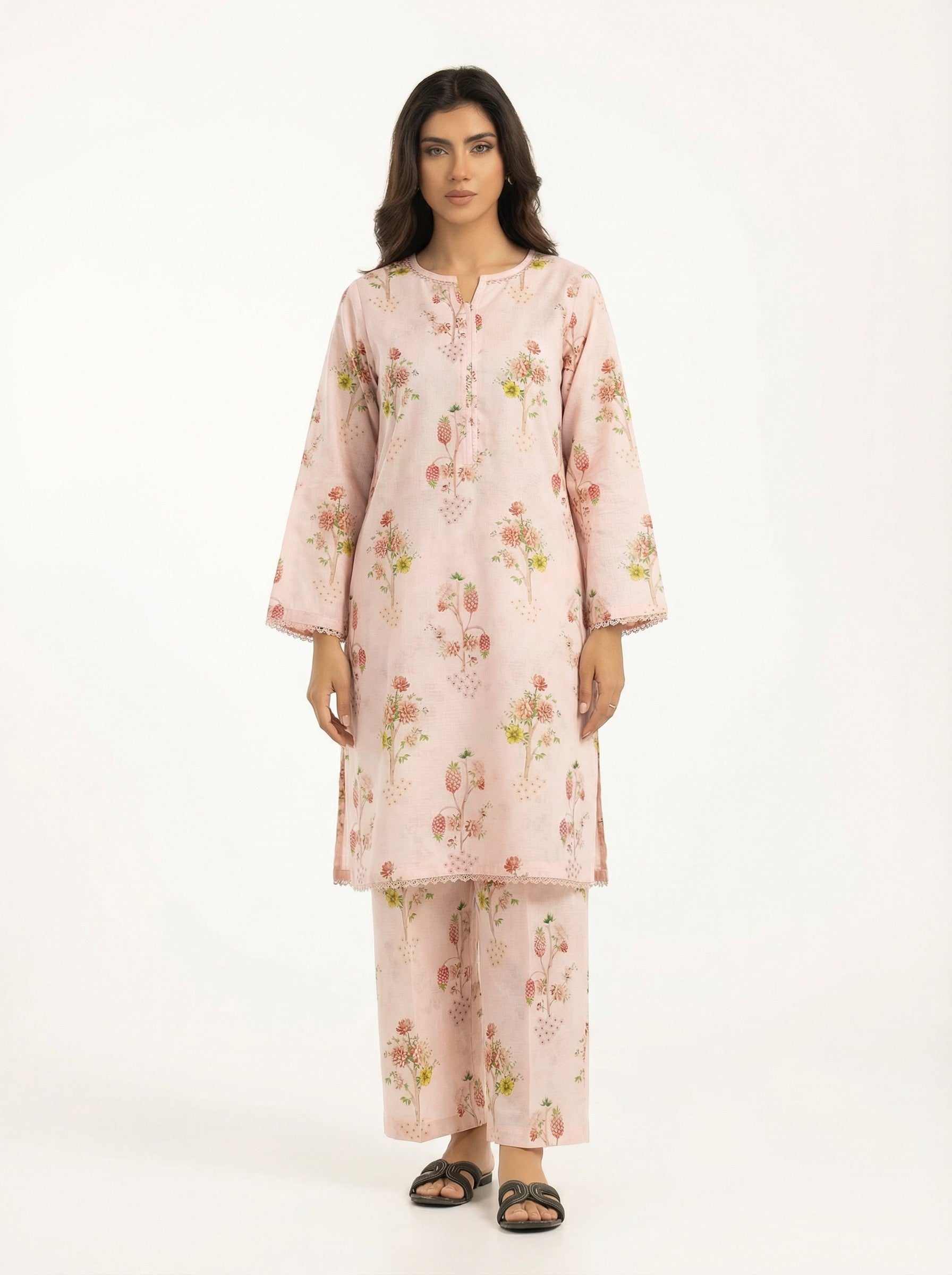 Turn heads with this blush pink floral 2 piece stitched suit. Crafted in a soft pastel shade with delicate floral prints, this ready-to-wear outfit includes a straight kurta and matching trousers—ideal for daily wear, casual outings, and semi-formal looks.