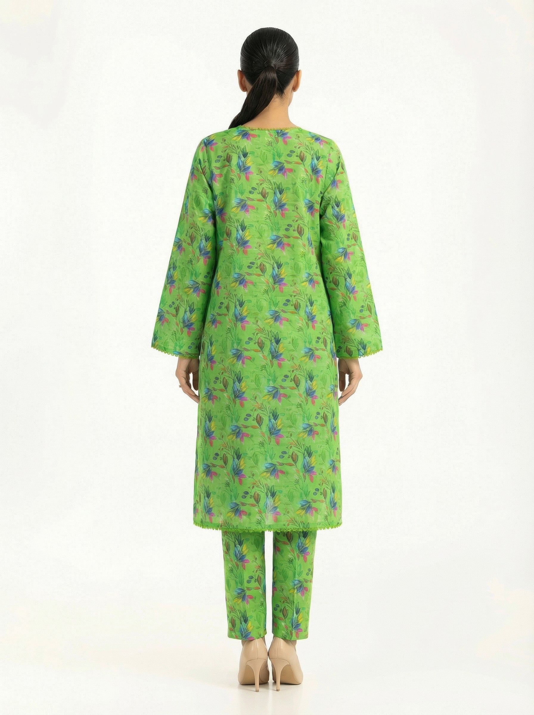Add a pop of color to your wardrobe with this parrot green floral 2 piece stitched suit. Designed with a straight-cut kurta and matching trousers, this ready-to-wear outfit features a vibrant botanical print—perfect for casual days, workwear, and festive daytime looks.