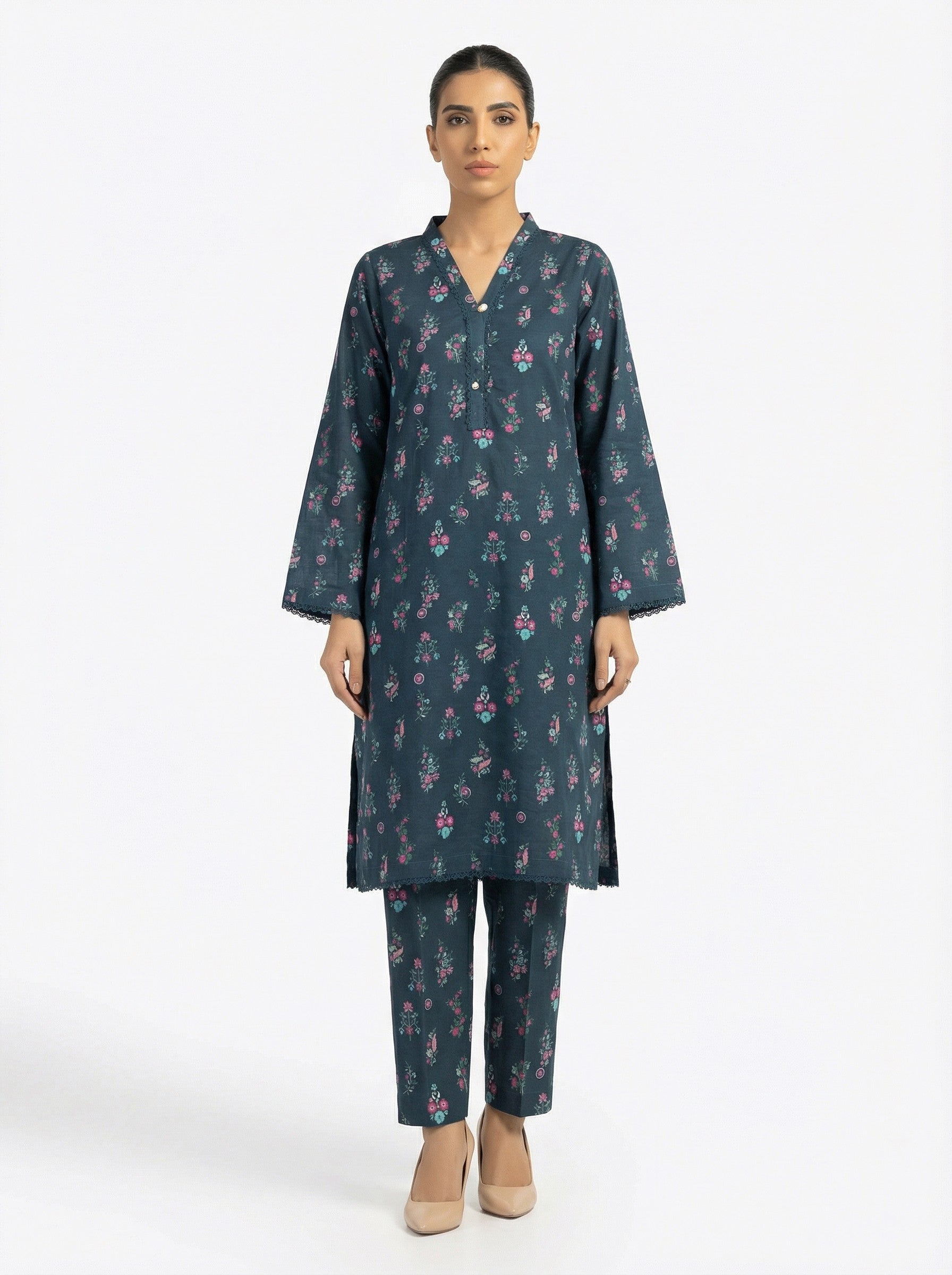 Stay effortlessly elegant in this teal green floral 2 piece stitched suit. Designed with a straight kurta and matching trousers, this ready-to-wear set features a delicate floral print on a rich dark base—perfect for workwear, everyday style, and casual occasions.